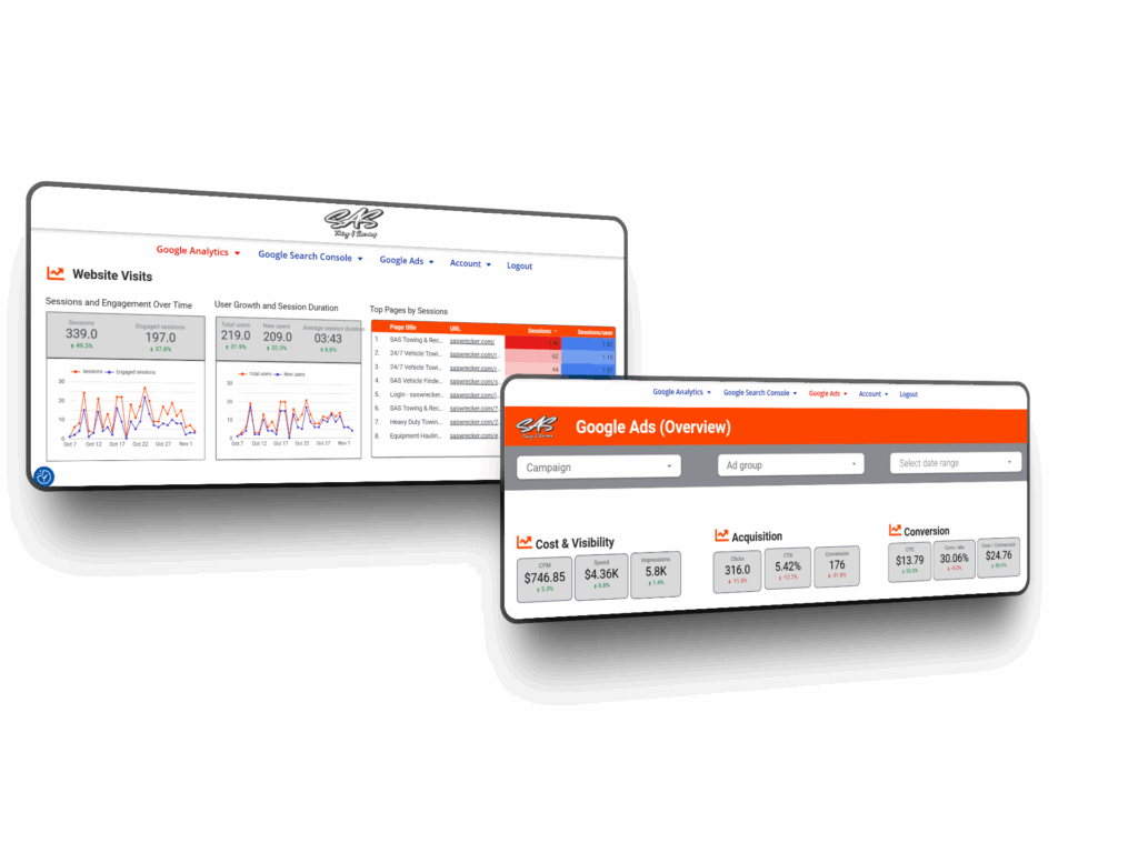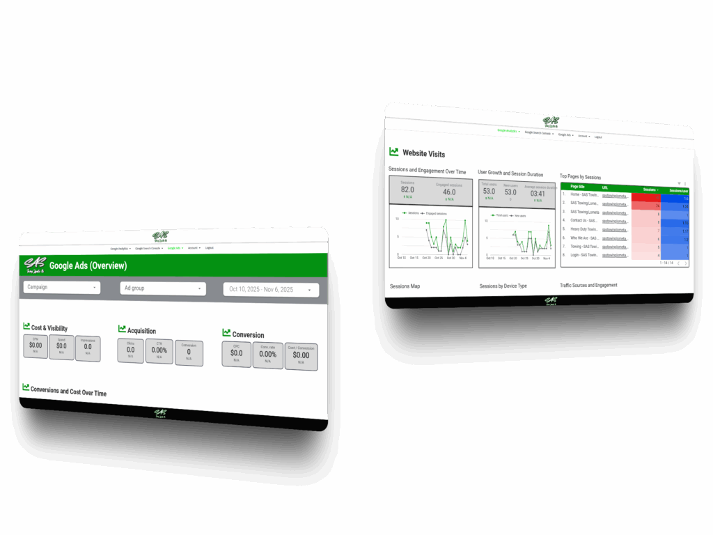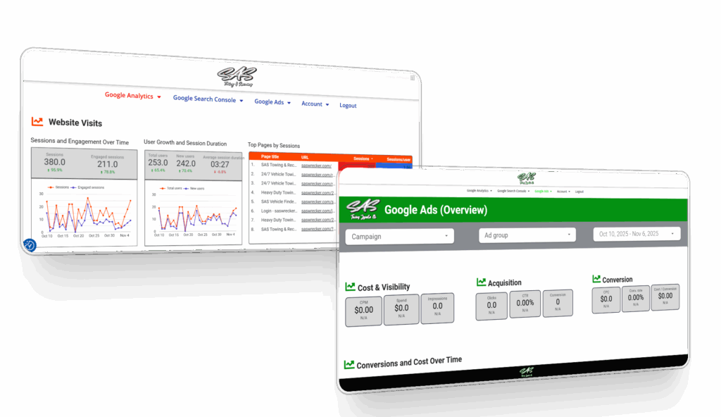 Tow360™ Analytics gives towing companies full visibility into their digital performance. Built on real-world towing data, our dashboard connects your website, Google Ads, Search Console, and call tracking into one clear, easy-to-read platform. No guessing — just data that drives decisions.